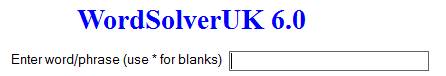 Enter a word or part of into the text box using * for missing letters e.g. was*i**ma**ine, then click the Word button in the WordSolverUK window and the result; washingmachine will be generated. If the Word isn’t found it might be worth trying a singular or plural form. Also note that the program doesn’t use blank spaces on input or output so a phrase such as good morning should be entered as goodmorning or as g**dmorn*** if doing a crossword etc.