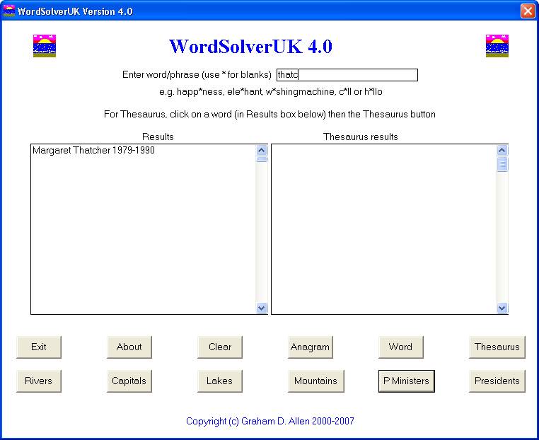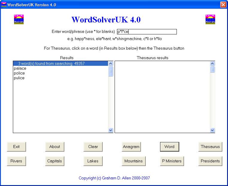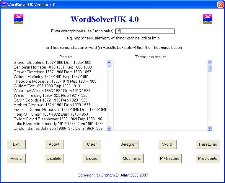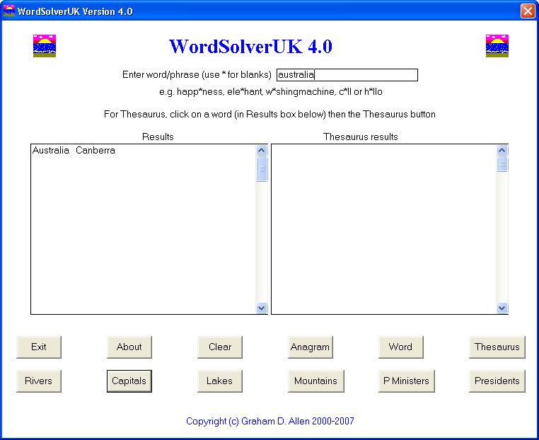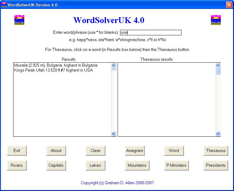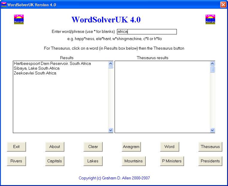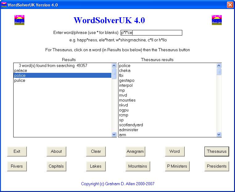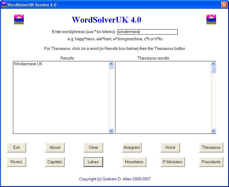 WordSolverUK is a computer program designed to help solve puzzles, crosswords and other such entertaining pastimes. It has a Word search facility (with letters missing like those seen in crosswords) a Thesaurus with approximately 2 million cross references and an Anagram solver. Version 4 onwards has extras such as Capital cities of the world, major Lakes, Mountains, Rivers, Prime Ministers (UK) and Presidents (USA) + many others all of which turn up in various puzzles from time to time.